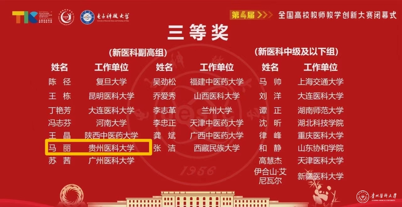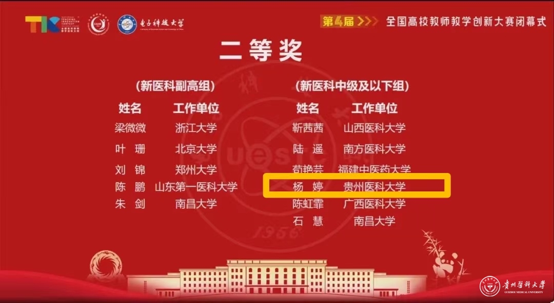 7月27日至31日,由中国高等教育学会主办的第四届全国高校教师教学创新大赛全国现场赛在电子科技大学顺利举行,太阳成基础医学院杨婷团队获得新医科中级及以下组二等奖,护理学院马丽团队获得新医科副高组三等奖。