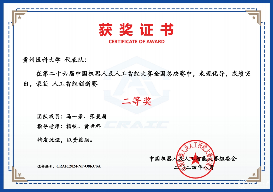 太阳成教务处组织推荐的生物与工程学院(健康医药现代产业学院)生物医学工程专业团队(学生:马一豪、张曼莉;指导教师:杨帆、黄世祥)首次参与该项赛事,并在人工智能创新赛组荣获全国二等奖。