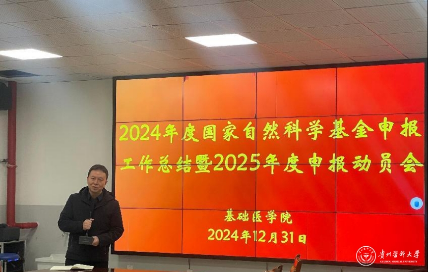 2024年12月31日,基础医学院在云漫湖校区召开2024年度国家自然科学基金申报工作总结暨2025年度国家自然科学基金申报启动会。校党委副书记汤磊出席会议并讲话,科技处处长李一欣、副处长郑林,基础医学院、分子生物学重点实验室、组织工程与干细胞实验中心和转化医学研究中心、贵州省常见慢性疾病发病机制及药物研究重点实验室主要负责人,基础医学院PI团队负责人、教研室/实验室(中心)负责人和上述部门拟申报2025年国家自然科学基金人员参会。会议由分子生物学重点实验室主任、基础医学院副院长张春林主持。