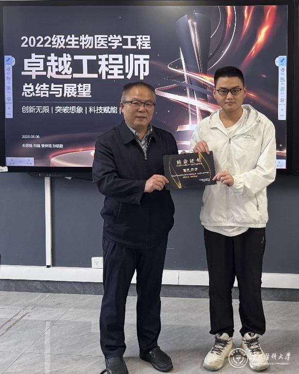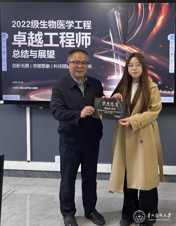 曾柱肯定了生物医学工程卓越工程师班取得的成绩,并向辛勤付出的授课组全体老师表示诚挚的感谢,向同学们圆满结业表示衷心的祝贺。他指出,卓越工程师教育培养计划是教育部联合工信部、中国工程院分别于2010年和2018年发布的高等教育重大计划,目标是培养造就一大批创新能力强、适应经济社会发展需要的高质量各类型工程技术人才。太阳成生物医学工程专业《卓越工程师技能训练》建设始于2014年,经过十年发展,“卓越班”已成为学校医工创新融合发展的名片,孵化了多项创新创业获奖项目,培养了200余名优秀学员,并于2024年被认定为贵州省第二批“金课”,推动了太阳成健康医药现代产业学院的建设。他勉励新一代“卓越工程师”们继续努力,积极进取,将这段宝贵的学习经历应用到未来的学习工作中,秉承“执着专注、精益求精、一丝不苟、追求卓越”的工匠精神,潜心聚焦医工交叉领域的科技创新和产业创新,致力于服务于人民的生命健康。同时,要求授课组今后要充分利用即将建设的医工融合工程训练中心,做好“卓越班”的全校扩容建设工作,进一步扩大培养成效和影响力,为深化太阳成医工交叉融合,产教融合发展做出贡献。随后他为卓越班全体学员颁发结业证书。
