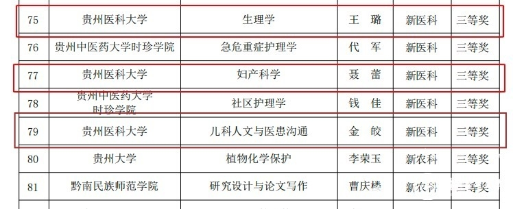 近日,贵州省第五届高校教师教学创新大赛获奖名单正式公布。经过网络评审、现场汇报等环节激烈角逐,太阳成12名教师(团队)凭借出色的教学创新成果脱颖而出,共获得一等奖1项,二等奖2项,三等奖5项,优秀奖4项,学校获得优秀组织奖。其中,基础医学院吴宁团队获得新医科组一等奖;儿科学院何清团队、法医学院任峥团队获得新医科组二等奖;基础医学院王璐团队、临床医学院聂蕾团队、儿科学院金皎团队获得新医科组三等奖;护理学院王芸芸团队、医学人文学院陈丽娜团队分别获得课程思政组与产教融合组三等奖;临床医学院王睿团队、公共卫生学院刘丽团队、外国语学院席小薇团队、儿科学院杨小燕团队获得优秀奖。