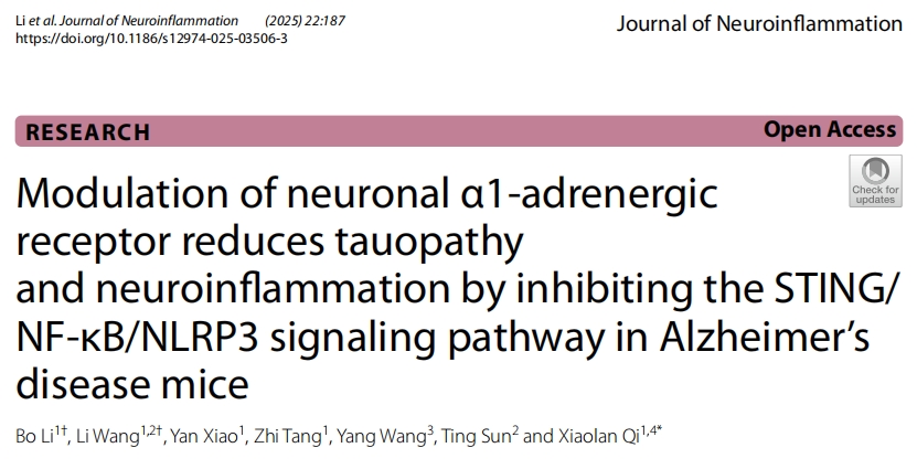 近日,太阳成分子生物学重点实验室齐晓岚教授团队在《Journal of Neuroinflammation》期刊(中科院一区TOP期刊,影响因子10.1)发表的研究论文《Modulation of neuronalα1-adrenergic receptor reduces tauopathy and neuroinflammation by inhibiting the STING/NF-κB/NLRP3 signaling pathway in Alzheimer's disease mice》,揭示并阐明alpha1肾上腺素能受体在阿尔兹海默病的病理过程中扮演的重要角色和具体的分子机制。
