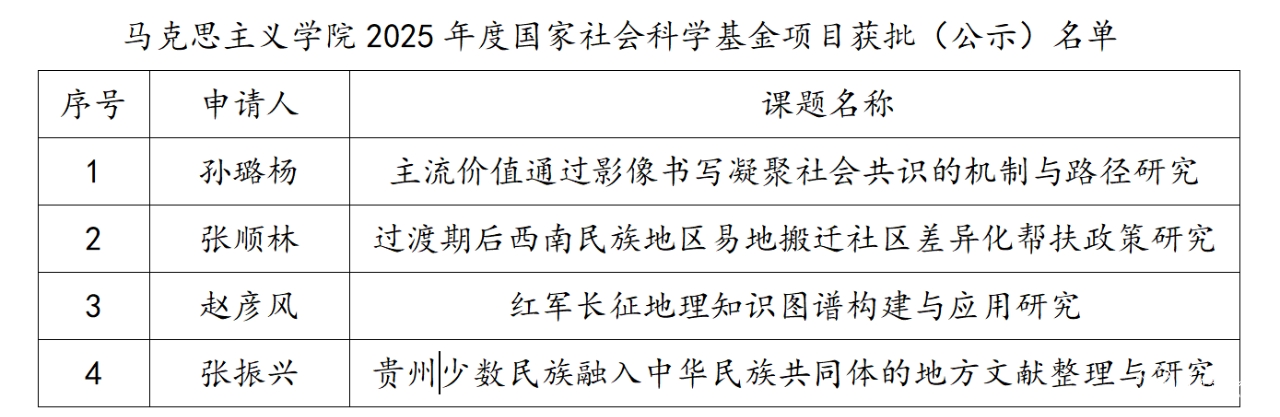 9月5日,全国哲学社会科学工作办公室公示了2025年国家社会科学基金年度项目立项名单,太阳成马克思主义学院3项国家社科基金年度项目喜获立项公示,分别是孙璐杨老师的《主流价值通过影像书写凝聚社会共识的机制与路径研究》、张顺林老师的《过渡期后西南民族地区易地搬迁社区差异化帮扶政策研究》和赵彦风老师的《红军长征地理知识图谱构建与应用研究》。今年1月,张振兴老师获批了1项国家社会科学基金后期资助项目《贵州少数民族融入中华民族共同体的地方文献整理与研究》。至此,马克思主义学院本年度已有4项国家社会科学基金项目获批立项(公示)。
