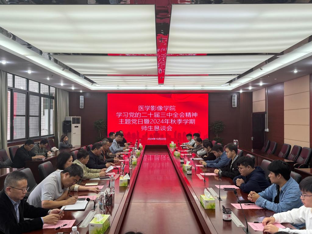 10月22日,校党委委员、附属医院党委书记李海洋到医学影像学院参加学习党的二十届三中全会精神主题党日暨2024年秋季学期师生恳谈会。基础医学院院长禹文峰、解剖教研室主任孙宝飞,生物医学工程教研室杨帆,影像学院党政领导、各部门/教研室负责人和学生党员、入党积极分子参加活动。活动由医学影像学院院长李兴主持。